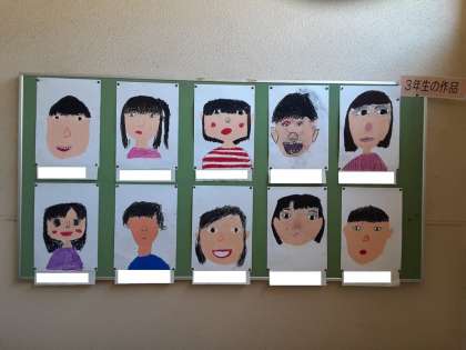 3年生の掲示板では、図画工作科で描いた「自分の顔」が掲示されていました。みんな表情豊かで、楽しそうです。