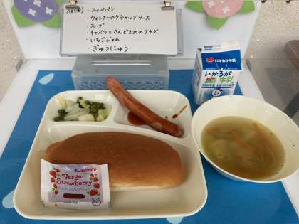 6月18日(金)の給食は、コッペパン・牛乳・ウインナーとケチャップソース・スープ・キャベツとさんどまめのサラダです。ウインナーソーセージはオーストリアのウイーンで最初に作られました。豚肉や牛肉を使って作り、太さは2センチメートルより細いものをいいます。本日の給食では、ゆでたウインナーソーセージにケチャップ味のソースをかけています。パリッとした食感、旨味とコクがたっぷりのお肉で、とても美味しかったです。