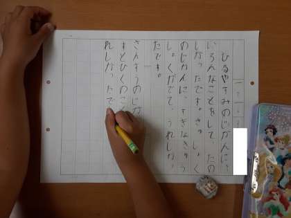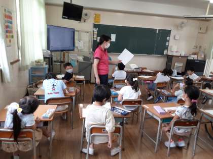 1年生は国語科で「こんなこと したよ」の学習をしています。1組では、自分がしたことを相手に伝えるように作文を書いていました。めあては、「正しくていねいに書こう」です。ひらがなを習い終えたばかりですが、句読点の使い方にも気をつけながら一所懸命に書いていました。お友だちのよく書けた作文を先生が読み上げ、それを参考にしてがんばって書いていました。