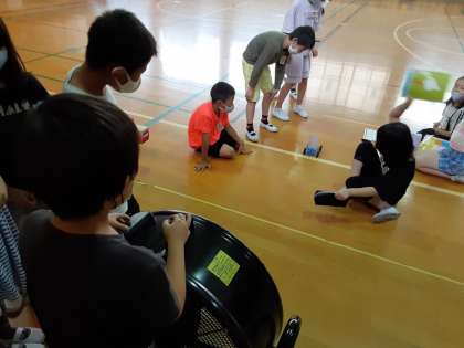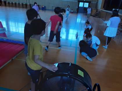 3年生は理科で「風とごむの力のはたらき」について学習しています。風で動くおもちゃを作ったので、送風機でどれだけ走るのかを実験していました。送風機を動かす係・おもちゃをセットする係・記録する係・メジャーをもつ係、グループで分担していました。でも、いざおもちゃが走り出したら、夢中になって追いかけて、背中で風を遮ってしまう場面が見られました。