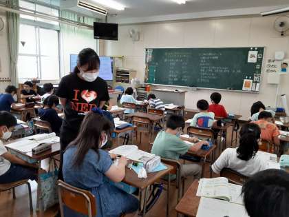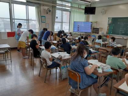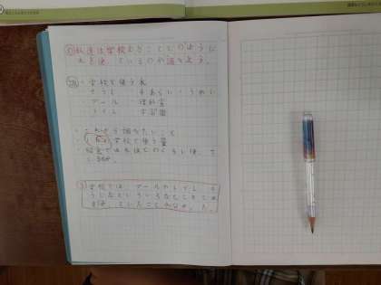 4年生は社会科で「命とくらしをささえる水」を学習しています。1組では、学校で水がどのように使われているのか調べていました。黒板には「学習園」「プール」「トイレ」「掃除」……。たくさん意見が出されていました。しかし、まとめのところで「学校では   」続きが空白でした。自分たちの言葉でまとめるようです。ここに違う表現でグループごとに、まとめを発表していました。