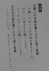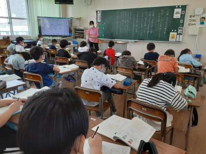 4年生では国語科で「お願いやお礼の手紙を書こう」の学習をしています。普段人にものを頼むときやお礼を伝えるときに、丁寧な言葉でできているでしょうか。1組では、お願いやお礼の手紙では、書き出しや終わりの文、全体の構成について、教科書を読んで考えていました。お友だちに話すような軽い言葉では手紙では通用しないようです。メールのようにもいかないようです。やがて学校活動が再開されて、社会見学先や地域の方々などへお礼のお手紙を書くときに、うまく書けるようになってほしいです。