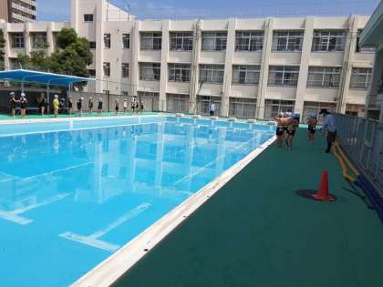水中を潜ったり、カニ歩きしたり、跳びはねたりして、小学校初めてのプールを楽しんでいました。