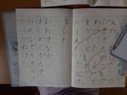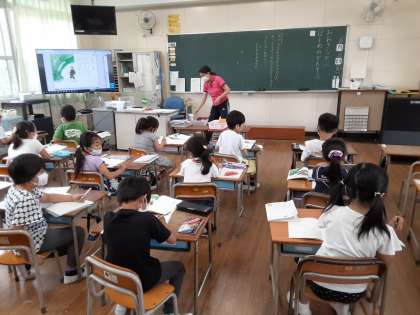 1年生では国語科で「おおきな かぶ」を学習しています。1組では「おおきな かぶ」を読んで、初めの感想について書いていました。最初に一マス空けて書き始めることを思い出していました。文章を書き写すのではなく、頭の中で文章を考えて書きます。慣れない1年生にとっては難しい課題ですが、がんばって書き始めていました。