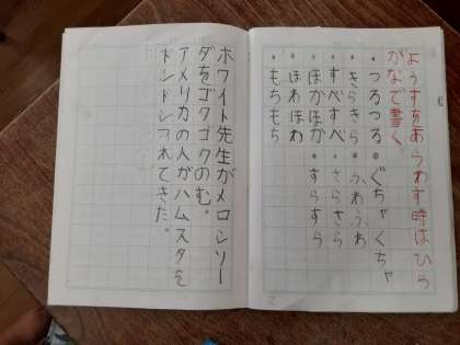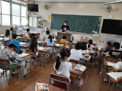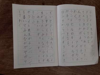 2年生では国語科で、カタカナで表す言葉について学習していました。「外国の地名や人の名前」「外国からきた言葉」「いろいろな音・動物の鳴き声」これらはカタカナで表します。この3種類の言葉を全てが入っている文を考えていました。外国の人の名前では、やはり身近なホワイト先生が多かったようです。文ができたら、ペアやグループで、3種類もれなく入っているかを確認し合っていました。