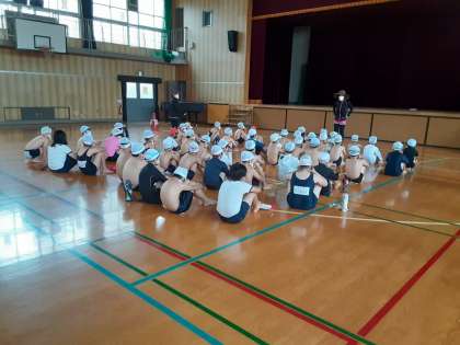 3年に続いて4年生のプール開きが始まりました。体育館で4年生2学級が集合しています。学校長の話を一言もしゃべることなく真剣な目をして聞いていました。「事故なく安全に水泳学習をするぞ。」という子どもたちの強い気もちを感じました。入水している写真は撮れませんでしたが、楽しんで取り組んでいたようです。