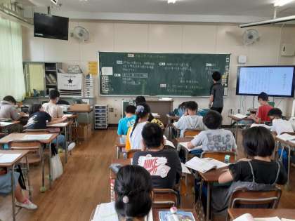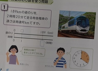 6年生では算数科で「分数のわり算」を学習しています。本時では、下記のような問題を解いていました。速さを求める問題ですが、道のり189kmとかかった時間(2時間20分)がわかっています。20分を時間に直さなければ計算できません。6年生山場の1つになるような難しい問題ですが、これまでの学習を思い出して取り組んでいました。