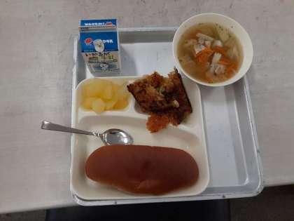 6月23日(水)の給食は、黒糖パン・牛乳・カレードリア・豚肉とキャベツのスープ・りんごです。ドリアは、ライスグラタンともいいます。ピラフにホワイトソースをかけて、パン粉、チーズをのせ、オーブンで焼いて作ることが多いです。今回は、カレーのルウの素やクリームなどを使ったカレードリアです。外はカリッと、中はもちっとしています。鶏肉たっぷり、チーズの香ばしさとカレーの風味も効いて、とても美味しくできあがっています。