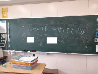 4年2組教室の黒板に「おたん生日 おめでとう ○○くん □□くん」と書かれていました。学級活動の時間に、体育館でお誕生日を祝う取り組みをしていたようです。みんな楽しそうで、いきいきと活動していました。