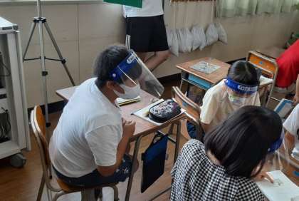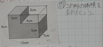 体積1 公開日 2021/06/24 更新日 2021/06/24 お知らせ 5年生は算数科で「体積」を学習しています。直方体や立方体の体積の求め方を学びました。本時では、下記のような立体の体積の求め方を考えます。方法の見通しでは「横切りチーム」「つけたしチーム」「たて切りチーム」3通り出ました。 グループに分かれて、自分が考えた求め方を説明し合います。その中の1つの方法を選んで、相談しながらホワイトボードに説明を書いていました。 いいね(0)