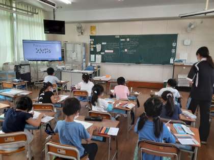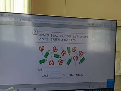 1年生では算数科で「ひき算」の学習をしています。1組では「はさみが8ほん えんぴつが 6ぽん あります。どちらが なんぼん おおいですか。」の問題に取り組んでいます。「くらべるので ひき算」という見通しが立っていました。式を立てて、計算はできました。答えを書くときにも、気をつけてほしいことがあります。「〇○が △ほん おおい。」