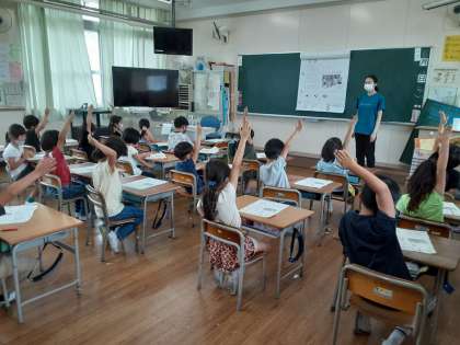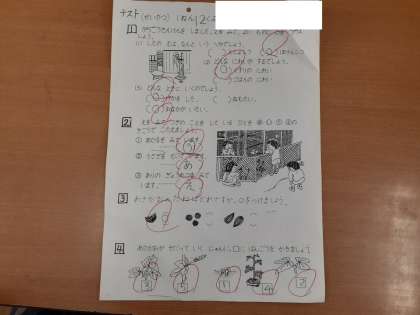 1年2組では生活科テストの答え合わせをしていました。学校たんけん・春の生きものを育てる学習の内容でした。アサガオが育っていく絵を順に並べる問題は、少々迷ったでしょうか。それでも、観察カードを描くときに、双葉や本葉の形に気をつけて観ていたので、間違えなかった児童がおおかったようです。