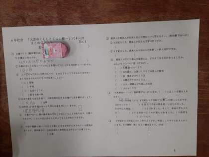 大昔のくらしと国の統一 公開日 2021/07/01 更新日 2021/07/01 お知らせ 6年生は社会科で、中国と日本につながりのある人物「鑑真」「阿倍仲麻呂」について調べていました。当時の中国、唐から文化や政治のしくみ・仏教など、日本が学んだことは多かったようです。 そのあと、「大昔のくらしと国の統一」のまとめプリントに取り組んでいました。まずは教科書を見ずに自力で考えます。結構できていたようです。 いいね(0)