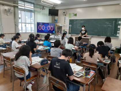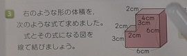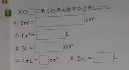 体積 たしかめポイント 公開日 2021/07/01 更新日 2021/07/01 お知らせ 5年生では算数科で「体積」を学習しています。本時では、まとめの意味で「たしかめポイント」の問題を解いていました。「8立方メートル=□立方センチメートル」「1立方メートル=□L」早速難問が出てきています。0の数、正しく書けたでしょうか。 最後に、複雑な立体の体積を求めます。児童は「○○法」などネーミングして解き方を作り出したので、この問題はよくできたようです。 いいね(0)