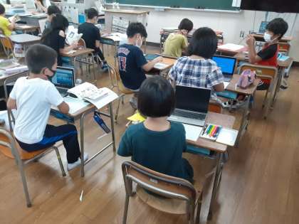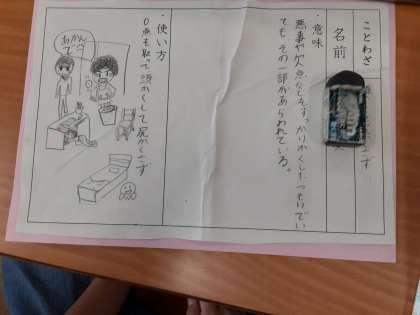 4年生では「ことわざ」「故事成語」を本やタブレット端末を使って調べていました。説明の絵が入っていて、読み手が楽しく読めるように工夫されていました。