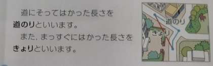 道のりときょり 公開日 2021/07/01 更新日 2021/07/01 お知らせ 3年生は算数科で「長い長さを表そう」について学習しています。本時では「道のり」と「きょり」について学んでいました。あんさんの家から学校まで、距離は600mですが、道のりはもっと長いようです。「道のり」と「きょり」どちらもよく使うので、慣れてほしいと思います。 いいね(0)