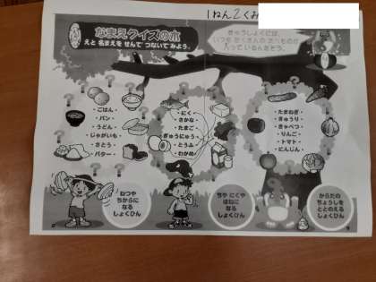 1年生では、食育の授業で「なまえクイズの木」に取り組んできました。妖精がやってきて、なまえクイズの木を植えました。黄・赤・青3色あります。赤い木にはいくつかの食材の実がなっています。中央にある「にく」の文字と繋げました。同様に、黄色の木・青色の木も文字と食材を結んでいきます。
