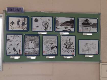 6年生の掲示板に、水墨画が飾られていました。こうして見ると、芸術作品が並んでいるようです。