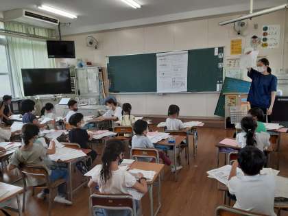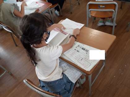 1年生も入学して3か月が経ちました。1学期の間に行ったテストの枚数もたくさんになっています。2組では、終わったテストをファイルに整理していました。教科ごとに、また、実施した順番に綴じていきます。先生が「次、○○のテストです。」と言うと、みんな選び出して、その順に並べていました。1学期成長の跡を残す大事な作業ですので、面倒がらずがんばってほしいです。