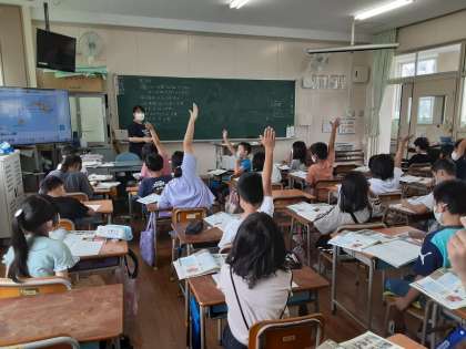 3年生は社会科で「パン工場で働く人々」について学習しています。本時では、原料の小麦やバターがどこから来たのかを調べました。北海道やいくつかの国からやってくることがわかりました。北海道について、知っている児童が結構いました。行ったことがある児童もいるようです。先生から「北海道と言えば……。」という問いかけに反応は薄かったようです。これから、社会科で各地の気候や産業などを学習していきます。興味をもってくれたらと思います。
