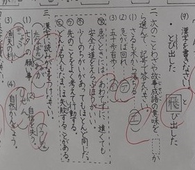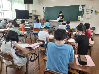 4年生では国語科で「走れ」の学習をしていました。1組ではテストの答え合わせ・やり直しをしていました。特に間違いやすいところを重点的に振り返っていました。「とびだした」の「飛」は正しく書くことが難しいようです。書き順も正確に書けるでしょうか。「漁夫の利」の読み仮名も「ぎょうふのり」と間違えることがあるので、注意するように話がありました。採点とは直接関係のない「先のことをよく考えて行動する」という選択肢がありました。同じ意味のことわざを発表しようとがんばっている児童の姿が見られ感心しました。