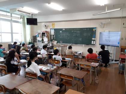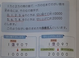 4年生では算数科で「およその数で表そう」の学習をしています。2組では、滋賀県の4年生の数13907人、岡山県の4年生の数17097人、それぞれを1万の位までの数への表し方について話し合っていました。数直線で、千の位を切り上げすればいいのか気利下げすればいいのかを考えていました。「1万の位までの概数」は「〇の位を四捨五入する」これから何度も出題される引っかかりやすい問題の1つです。