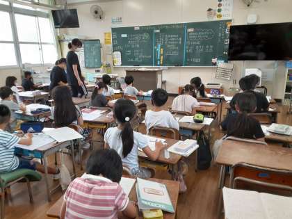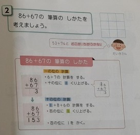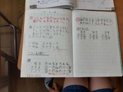 答えが百の位になる筆算 公開日 2021/07/07 更新日 2021/07/07 お知らせ 2年生では算数科で「たし算」を学習しています。本時では、「2けた+2けた」のたし算で、答えが百の位までくり上がる場合の筆算の仕方を考えていました。「100のまとまりができたら、百の位へくり上がる。」基本的には、これまでの計算と変わらないようです。位をそろえて筆算を描くことが、間違えにくいようです。この後、ドリルなど練習問題に取り組んでいました。 いいね(0)