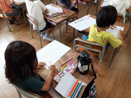 できた児童は、これまでの書写プリントをまとめて、挿絵に色塗りをしていました。
