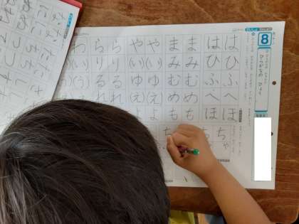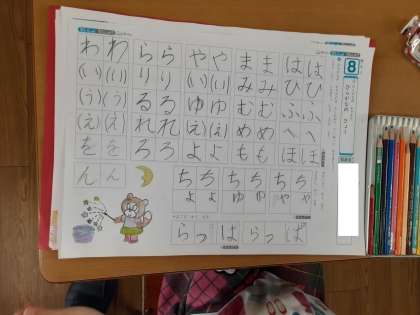 1年生では国語科で、ひらがなを全て習いました。2組では書写の時間にひらがなの表を使って練習をしていました。まず線をなぞるようにして「あいうえお」次は白いマス目に「あいうえお」最初の頃に比べると上手になってきたと思います。