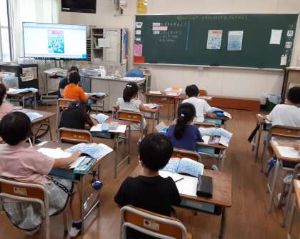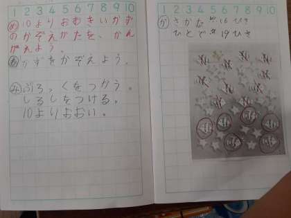 1年生では算数科で「10より おおきい かず」の学習をしています。1組では10より大きい数の数え方について考えていました。方法の見通しでは「ブロックを使う」「印をつけて数える」結果の見通しでは「10より多い」という意見が出ました。ヨット・魚・ヒトデ、数えるのが抜けていたり、同じものを2度数えたりせず、正確に数えられたようです。
