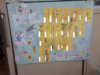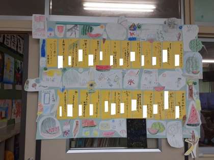 4年生教室前に掲示されている模造紙には、各児童の願い事が書かれた短冊が貼られ、その周りに夏の風物詩が飾られています。七夕の日は雨でしたが、願い事が叶ってほしいと思います。