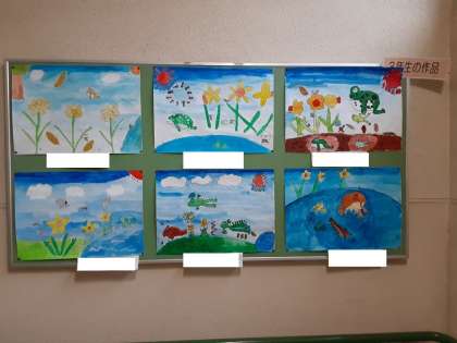 すいせんのラッパ 公開日 2021/07/08 更新日 2021/07/08 お知らせ 3年生の掲示板に、国語科で習った「すいせんのラッパ」の絵が掲示されていました。すいせんの花の周りを個性的なカエルが跳びはねている様子がわかります。 いいね(0)