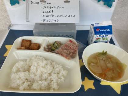 7月13日(火)の給食は、ごはん・牛乳・ゴーヤチャンプル・すまし汁・あつあげのしょうがじょうゆかけです。ゴーヤチャンプルに使われている「にがうり」には、ビタミンCが多く含まれています。にがうりのビタミンCは、加熱しても壊れにくいのが特徴です。にがうりの苦み成分には、食欲を増す働きがあります。ゴーヤチャンプルは「ゴーヤ」「ツルレイシ」ともよばれています。ビタミンCを十分にとって、食欲を増して、この夏を乗り越えましょう。