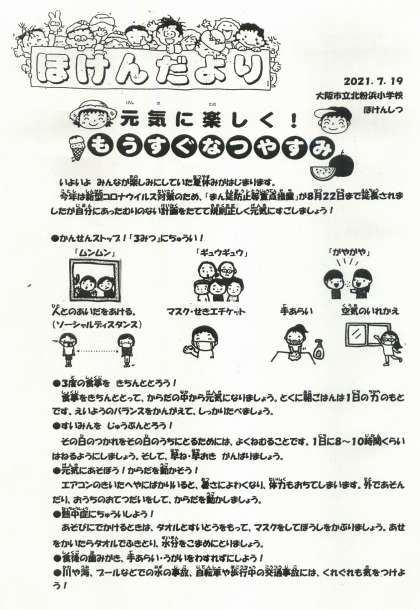 もうすぐみんなが楽しみにしている夏休みになりますが、今年度は新型コロナウイルス対策のための「まん延防止等重点措置」が8月22日まで延長されました。ほけんだよりをよく読んで、対策を十分に取りながら、夏休みを元気に過ごしてほしいと思います。