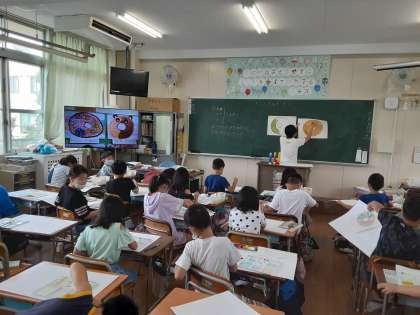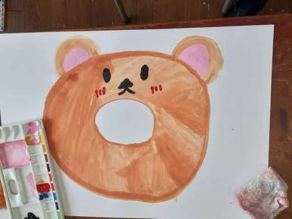 3年生では図画工作科で「オリジナル ドーナツ」に取り組んでいました。形はドーナツなのですが、そこに目や耳・口・模様が加わって、不思議な「オリジナル ドーナツ」ができていました。ドーナツ色(薄い茶色?)を作ろうとして悩んでいました。