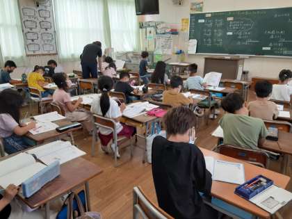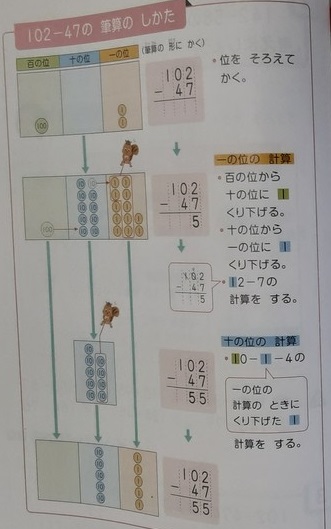 2年生では算数科で、百の位のあるたし算やひき算の計算について考えていました。数は大きくても、「位をそろえて1の位から計算する」基本は変わらないようです。「1けた+3けた」、「3けた−1けた」のひっ算を書くときに、空位のマス目を空けておいて、しかも位をそろえるのは違和感があるかもしれませんが、早く慣れてほしいです。