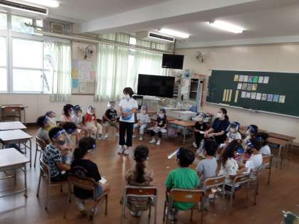 1年2組では学級活動の時間に「がんばる おたのしみかい」に取り組んでいました。「ちょうど「ばくだんゲーム」をしている最中でした。「ゴロゴロ ゴロゴロ……。」と言いながらボールを回します。「ドン!」のところでボールを持っていた人がアウトのようです。