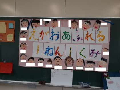えがお あふれる 1ねん 1くみ 公開日 2021/07/16 更新日 2021/07/16 お知らせ 1年1組の黒板に「えがお あふれる 1ねん 1くみ」の文字が掲示されていました。周りには学級全員の顔が貼られています。 また、その下には、「けんだま・じぇすちゃあげえむ・ぼうりんぐ」「みんなで きょうりょくして がんばろう」と書かれています。お楽しみ会の合言葉でしょうか。 いいね(0)