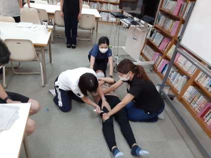 前半は、映像でエピペンの扱い方について学び、エピペンを打たれる人、打つ人、体を抑える人に分かれて、実践練習をしました。後半は、第1発見者・校長・教頭・教務・養護教諭・かけつけた近くの教職員という設定で、エピペンを打つ人・記録する人・救急車を誘導する人など、対応を実際にシミュレーションしました。終わったら、研修で見えてきた課題について交流しました。
