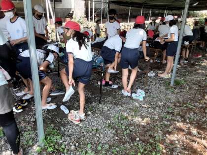 魚つかみです。上靴に履き替えて、ゴム手袋をして、準備完了です。