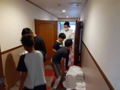 おはようございます。3日目、最終日です。朝起きて、布団をたたみ、シーツをまとめて廊下に出して、荷物をまとめて、、、。