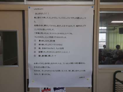 4年2組教室の入り口に「しりとりをしましょう」と題して、なにやら暗号文が書かれた紙が貼られていました。「教し室りにり来した人しかりら……。」朝登校してから、することの指示が書かれているようですが、暗号を読み取ることはできたでしょうか?