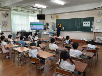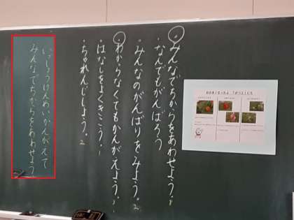 1年1組では運動会のスローガンについて考えていました。「みんなで ちからを あわせよう」「なんでも がんばろう」「はなしを よく きこう」「ちゃれんじ しよう」など、いろいろな意見が出されました。みんな小学校での運動会にとても意欲的です。みんなの意見を合わせて「いっしょうけんめい かんがえて、みんなで ちからを あわせよう」というスローガンになったようです。