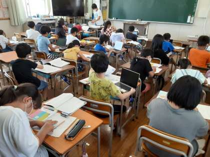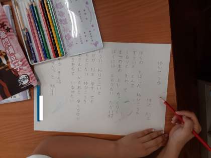 紙ひこうき 公開日 2021/08/27 更新日 2021/08/27 お知らせ 3年生では国語科で「紙ひこうき」を学習しています。本時では、詩の様子を思い浮かべながら視写していました。写し終わった児童からさし絵を描いていくのですが、紙ひこうきを折る様子や飛ばしている様子をタブレット端末で調べてもいいようです。1枚の折り紙から作られる紙ひこうきは何種類かあるようです。飛び方も多様です。いろいろな紙ひこうきが飛んでいる絵が描かれていました。 いいね(0)