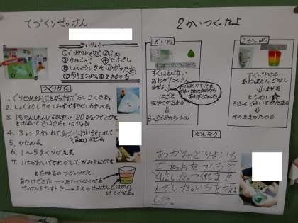 1年1組に夏休みの自由研究「てづくり せっけん」が掲示されていました。実験のようすが写真や詳しい文章でよくわかりました。