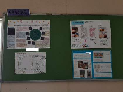 6年生の掲示板に、夏の自由研究が貼られていました。「星座」「ろうそく」……、課題はいろいろなところにあるようです。