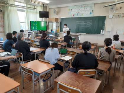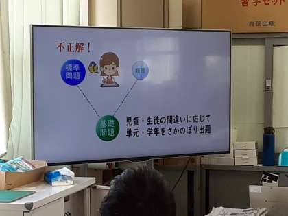 ICT担当の山内先生による「デジタルドリル研修会」を行いました。タブレット端末を活用して、国語・社会・算数・理科・英語の各単元を練習することができます。つまずいた内容では、基礎問題を振り返ったり、類題を解いていったりできるようです。練習を積み重ねるとコインがもらえ、単元をクリアしていくと銀や金のトロフィが得られるので、意欲的に取り組めそうです。