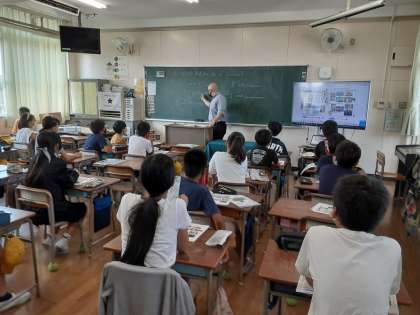 6年生は英語科で「What do you do in Summer?」の問いかけに正しく答えられるように学習していました。「I went to 〜.」「I enjoyed 〜.」「I made 〜.」などの基本文型を学んだあと、ホワイト先生の問いに英語で答えます。