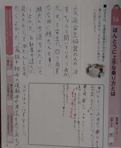 4年生では道徳科で「ほんとうに上手な乗り方とは」を学習しています。「はるき」は、交通安全教室で指導を無視してスピードを出して、みんなから「じょうずだなあ。」と褒めてもらいました。その後はるきは自転車事故に遭ってしまい、交通協会の方の「いちばん上手な乗り方は安全に気をつけて乗ることです。」という言葉を思い出しました。