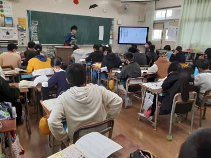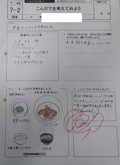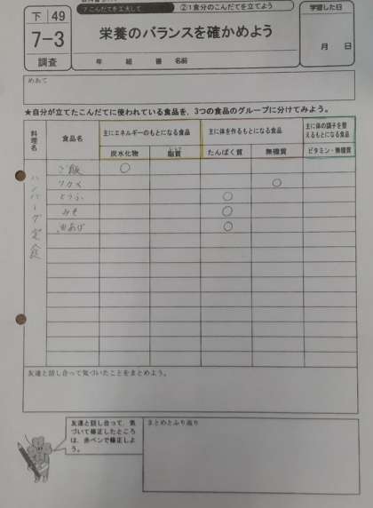 6年生は家庭科で「栄養のバランスを確かめよう」の学習をしています。前時に自分が好きな献立を考えていました。本時では献立から獲れる栄養素を「栄養素の働きによる食品の分類表」で調べていました。献立には、ご飯とみそ汁がついています。他のおかずから炭水化物や脂肪が意外に多く摂れるようです。栄養バランスを考えて、献立を見直していきました。
